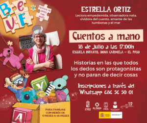 Estrella Ortiz propone una sesión en las que todos los dedos serán protagonistas y no pararán de decir cosas; y es que, con las manos, además, también es posible inventar artilugios, acariciar libros y pasar sus hojas para dejarnos atrapar por sus historias.