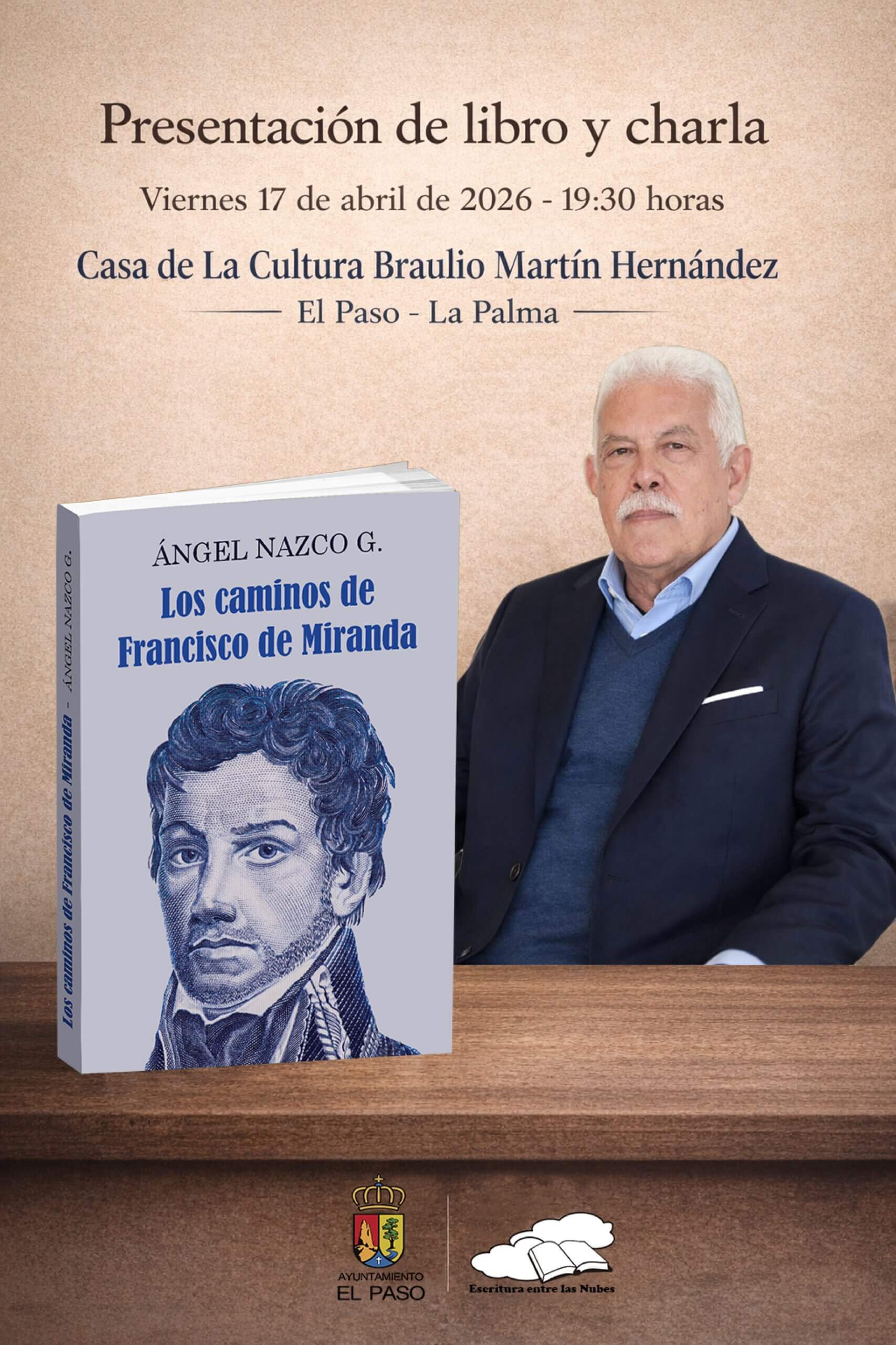El escritor pasense Ángel Nazco García presenta este viernes 17 de abril, a las 19:30 horas, su libro ‘Los caminos de Francisco de Miranda’ en la Casa de la Cultura Braulio Martín Hernández de El Paso, dentro de la programación cultural del Mes del Libro.